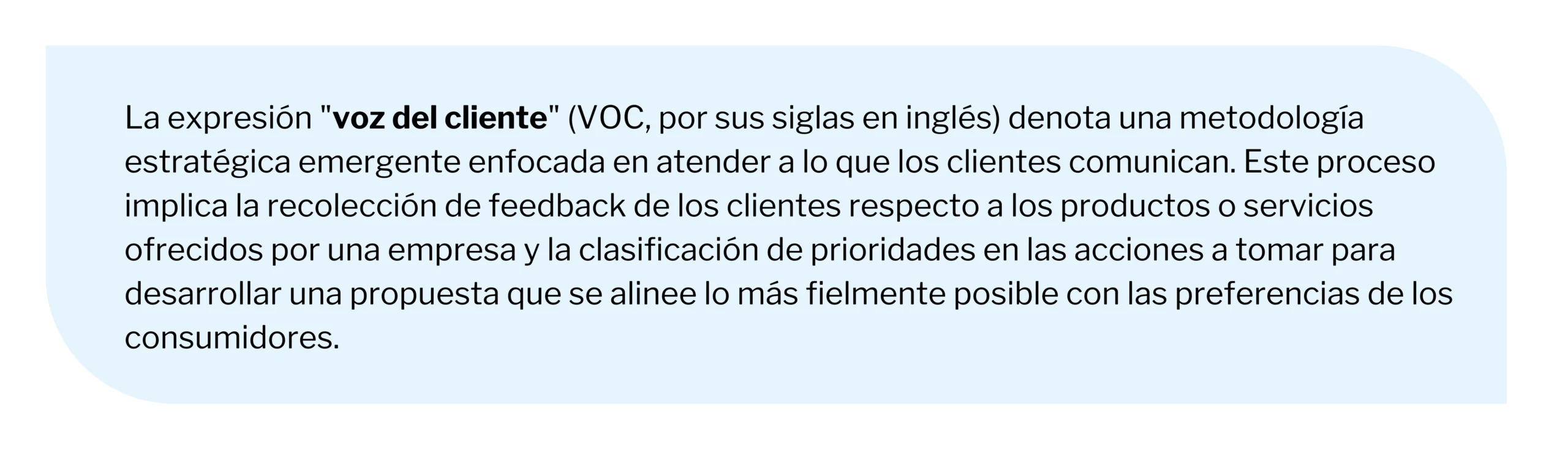 En la actualidad, los clientes disponen de una amplia variedad de métodos para expresar sus opiniones, deseos y anticipaciones hacia las compañías. El concepto de la voz del cliente se fundamenta en la atención continua a lo que estos expresan, brindando a las empresas la oportunidad de ajustar y perfeccionar sus tácticas con el fin de elevar al máximo la contentura del consumidor. Pero, ¿que es la voz del cliente (VoC) exactamente? ¿Y por qué es tan relevante?