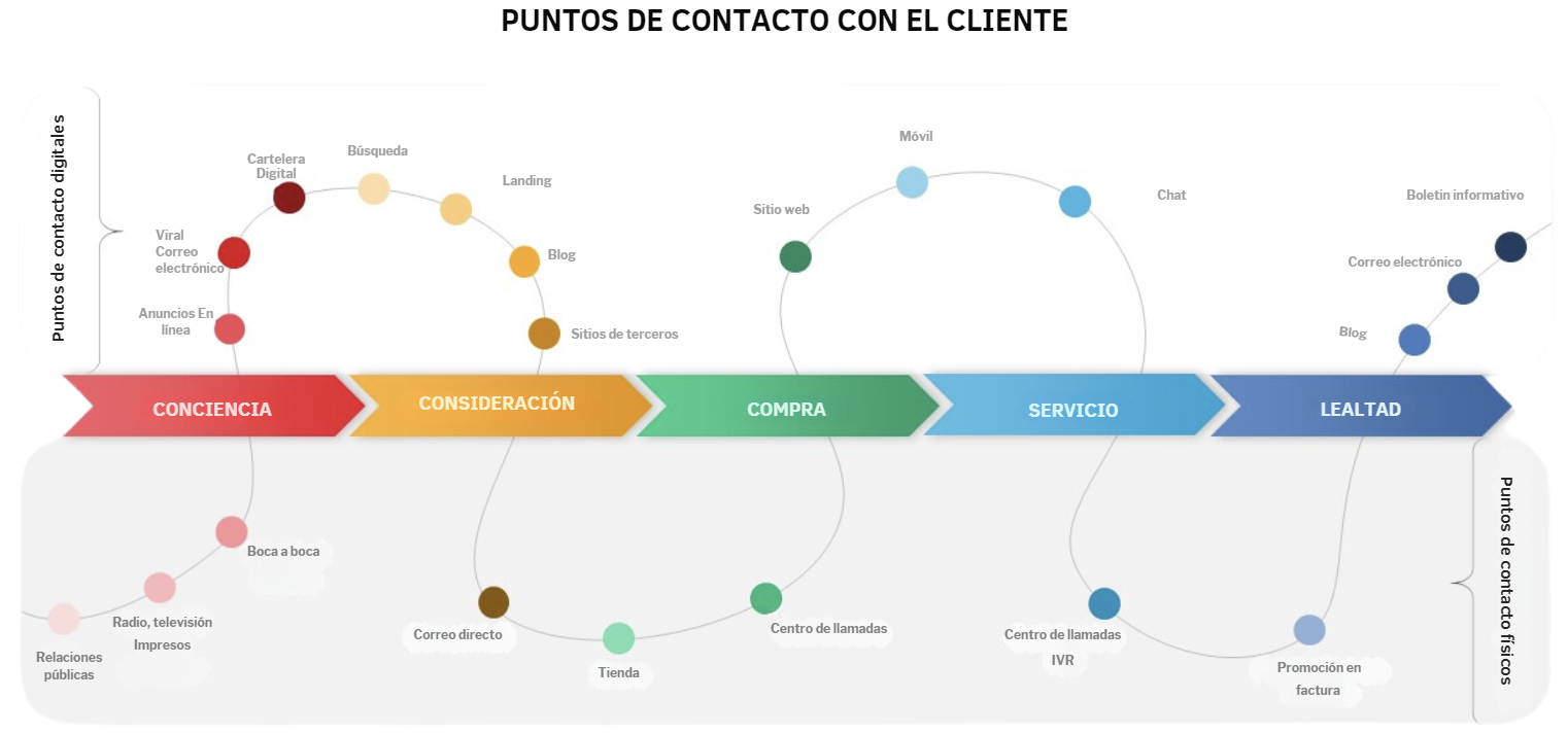 Un punto de contacto con el cliente es cualquier interacción que tiene un cliente con una marca. Esto incluye aspectos como: