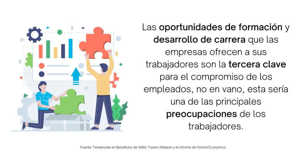 Para que un empleado se sienta comprometido, se le deben dar oportunidades adecuadas para el desarrollo personal en el trabajo. Esto podría tomar la forma de capacitación, promoción, más responsabilidad o la oportunidad de asistir a ferias comerciales, simposios o conferencias, fuera del trabajo.