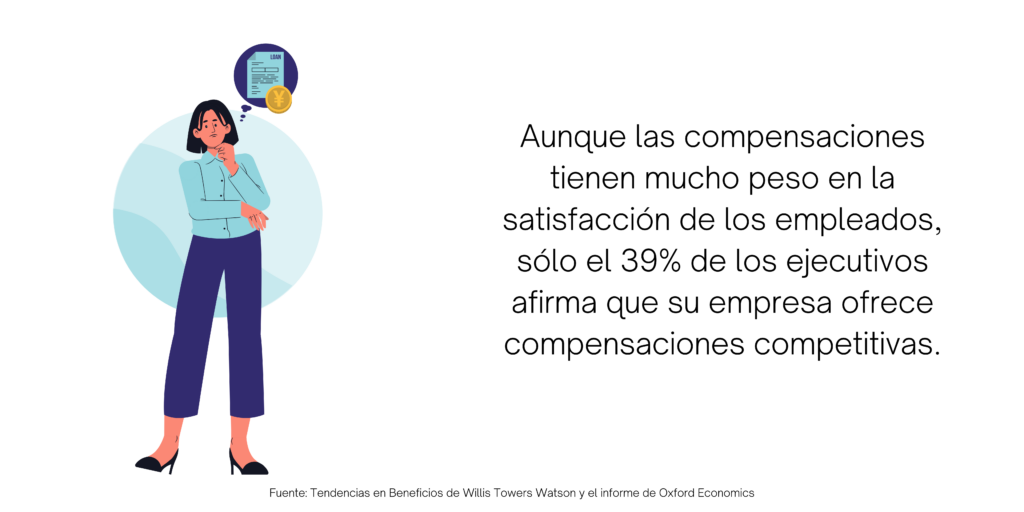 La compensación es posiblemente el factor más importante en lo que respecta a la satisfacción laboral. Dos elementos son los más importantes. En primer lugar, la escala salarial debe ser comparable y posicionada competitivamente frente a empresas similares en el área. En segundo lugar, debe permitir a los empleados mantener un nivel de vida y una calidad de vida superiores a la media.