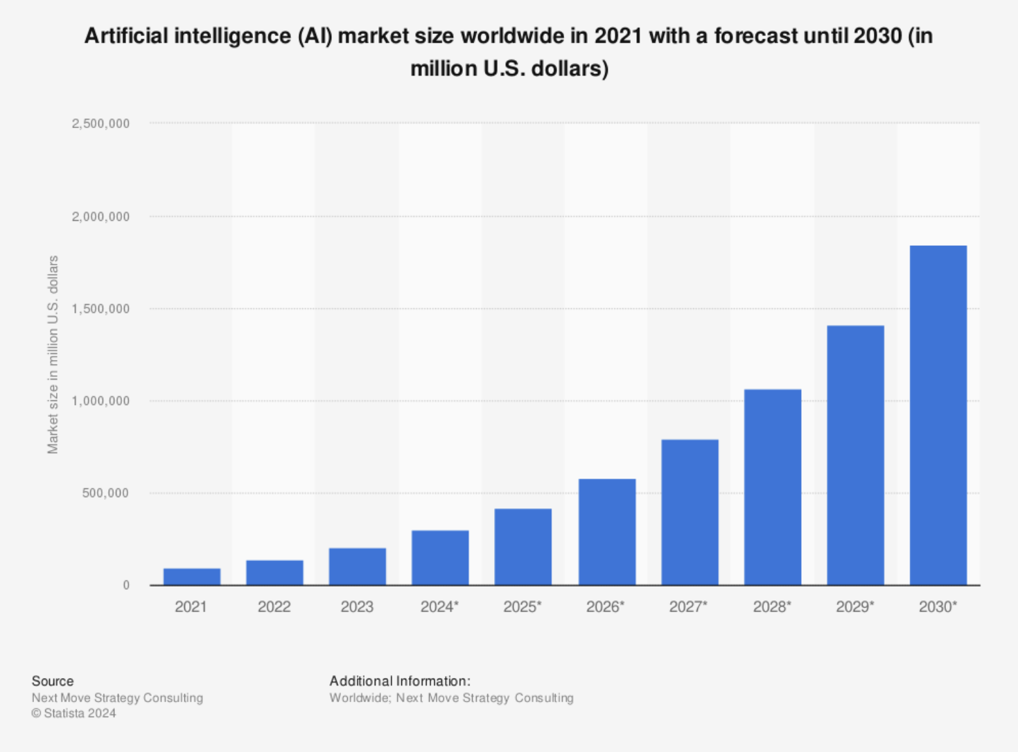 Tamaño del mercado de inteligencia artificial (IA) a nivel mundial en 2021 con previsión hasta 2030(en millones de dólares estadounidenses)