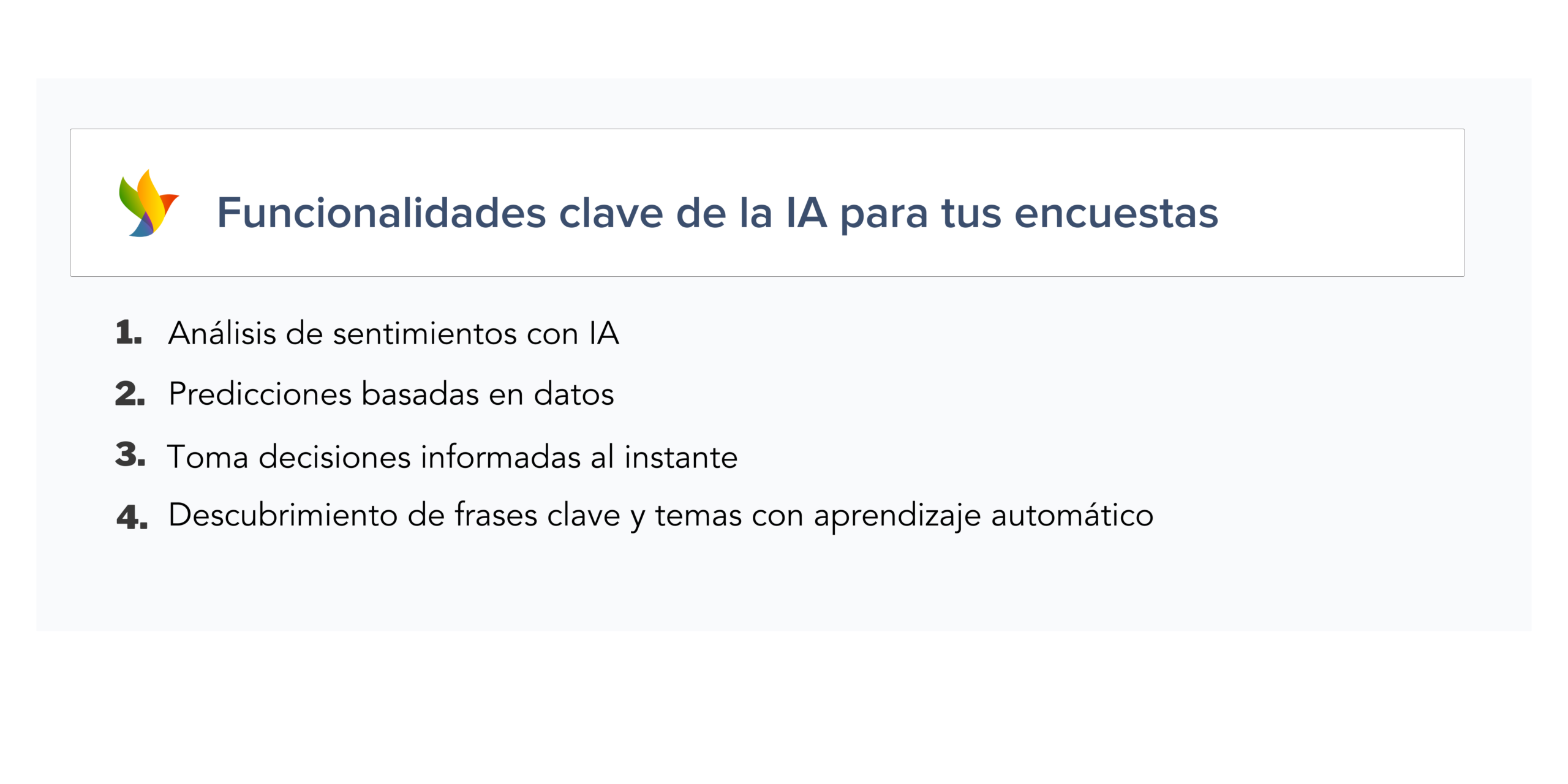 Incorporar la IA en las encuestas no es simplemente una cuestión de mantenerse al día con la tecnología; es una estrategia esencial para las empresas que buscan profundizar su comprensión de los clientes y superar a la competencia en el mercado actual. Veamos algunas cualidades de la IA para tus encuestas.